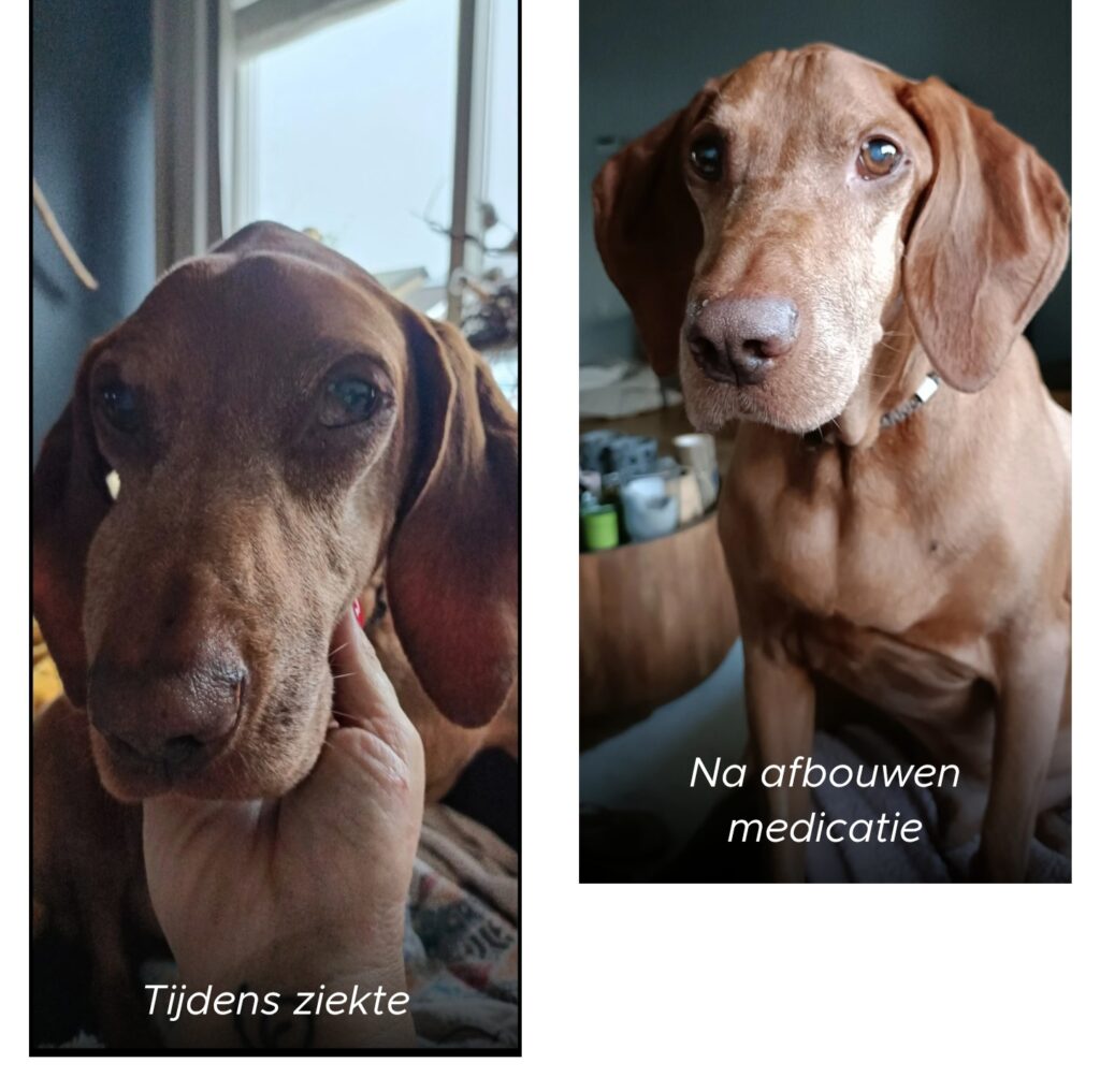 Teun zat door de ernst van de ziekte op 2 hele tabletten. Met alle ongemakken wat prednison met zich meebrengt zoals veel eten en drinken, ontzettend veel plassen, kale plekken op zijn lijf en aantasten van spierweefsel, ging ik al snel op 1 tablet over voor hem. In week 6 ben ik overgestapt op een halve tablet en in week 10 op een kwart. Week 12 vond ik erg spannend want ik wilde echt proberen de prednison er helemaal af te krijgen. De celzouten heb ik nog 4 weken doorgezet nadat ik gestopt was met de prednison. Na deze 4 weken ben ik met de celzouten ook afgaan bouwen en gaf ik ze om de dag aan Teun, gedurende 2 weken. Vandaag 12 oktober is dan ook de laatste dag voor de celzouten en hebben we op ruim 4 maanden tijd een mooi resultaat geboekt met Teun.
