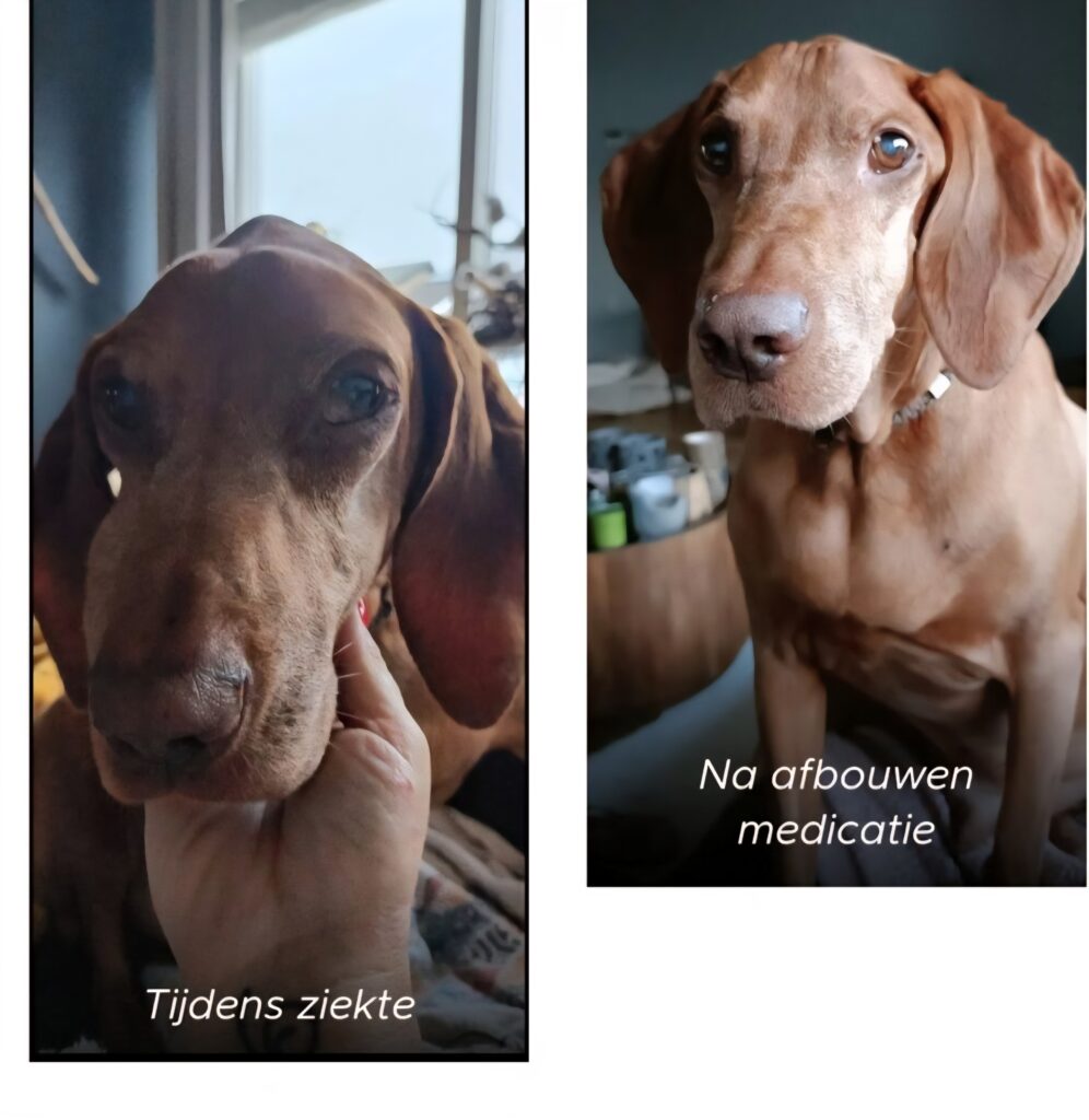Op foto 1 is duidelijk te zien dat Teun erg ziek was. En foto 2 is gemaakt de eerste week zonder medicatie en geheel weer de oude.